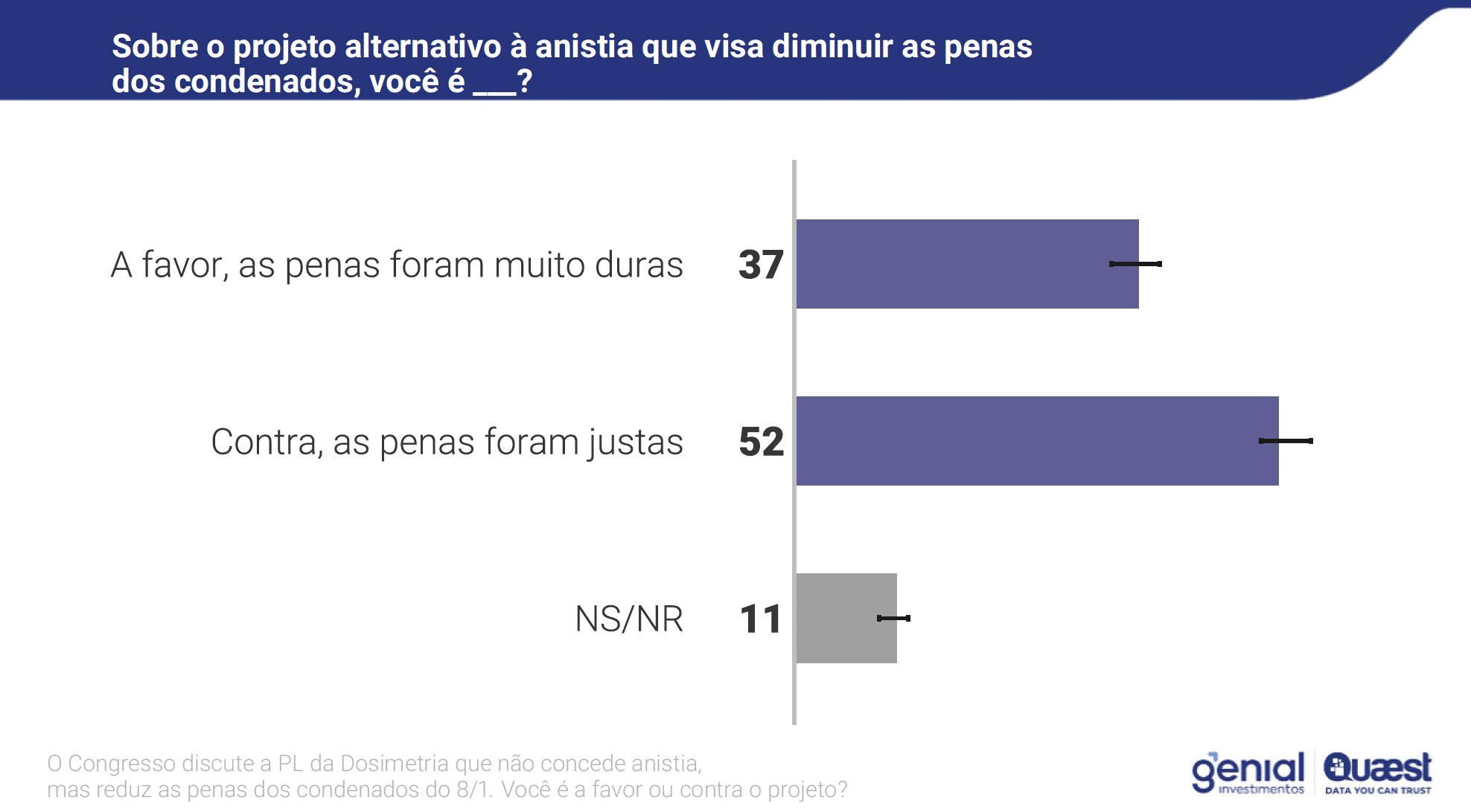 A maioria dos entrevistados também se opõe ao projeto de lei da Dosimetria, articulado por Michel Temer (MDB) e Aécio Neves (PSDB-MG), que propõe reduzir as penas impostas aos condenados pelos atos golpistas. De acordo com o instituto, 52% rejeitam a proposta, considerando as punições justas, enquanto 37% são favoráveis à redução das sentenças.