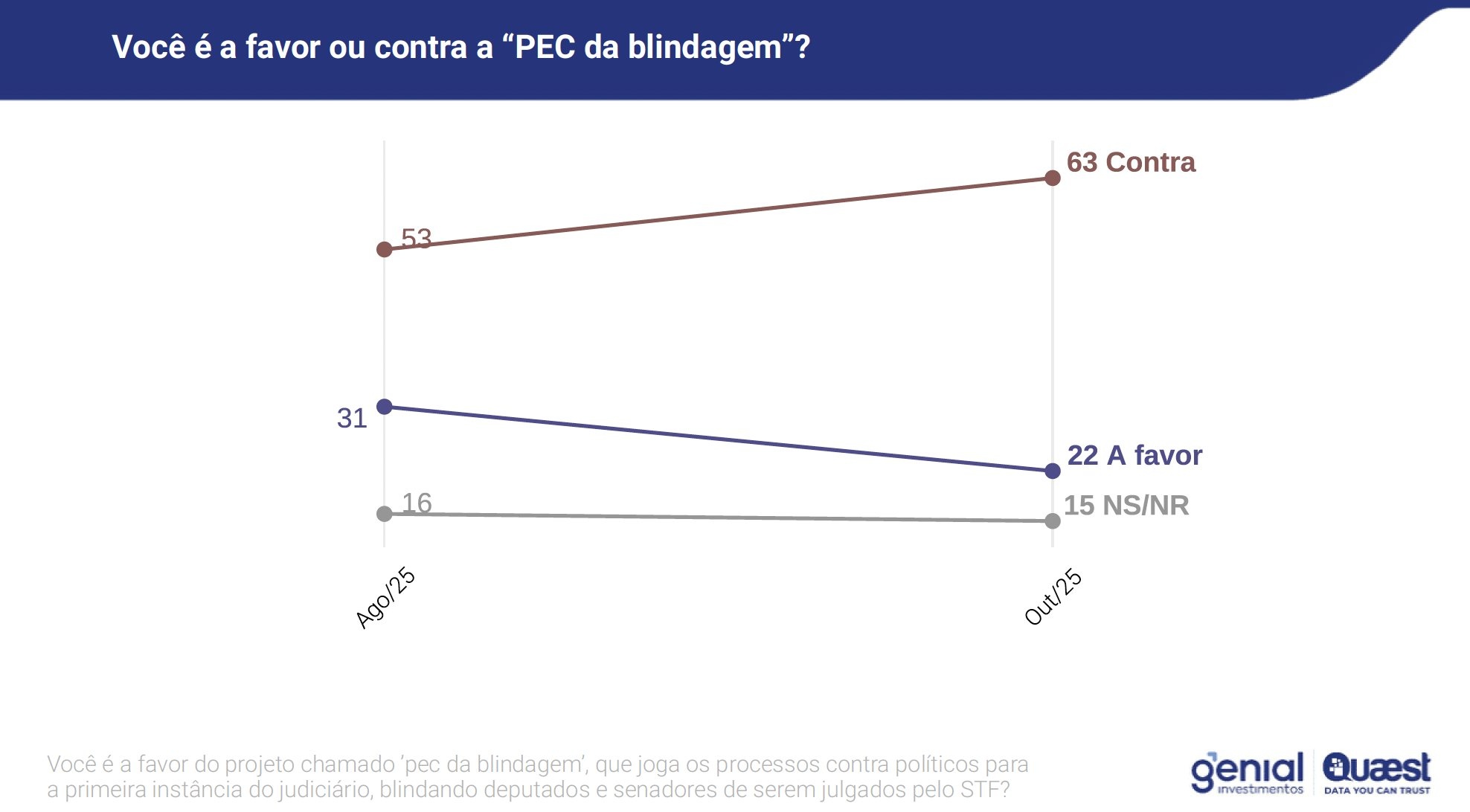 O levantamento aponta ainda ampla rejeição à chamada PEC da Blindagem, que limita a atuação do Supremo Tribunal Federal (STF) e do Ministério Público, dificultando a prisão de parlamentares. Segundo a pesquisa, 63% dos brasileiros são contra a proposta, e apenas 22% a apoiam. A medida foi aprovada na Câmara, mas acabou arquivada pelo Senado após forte reação pública.