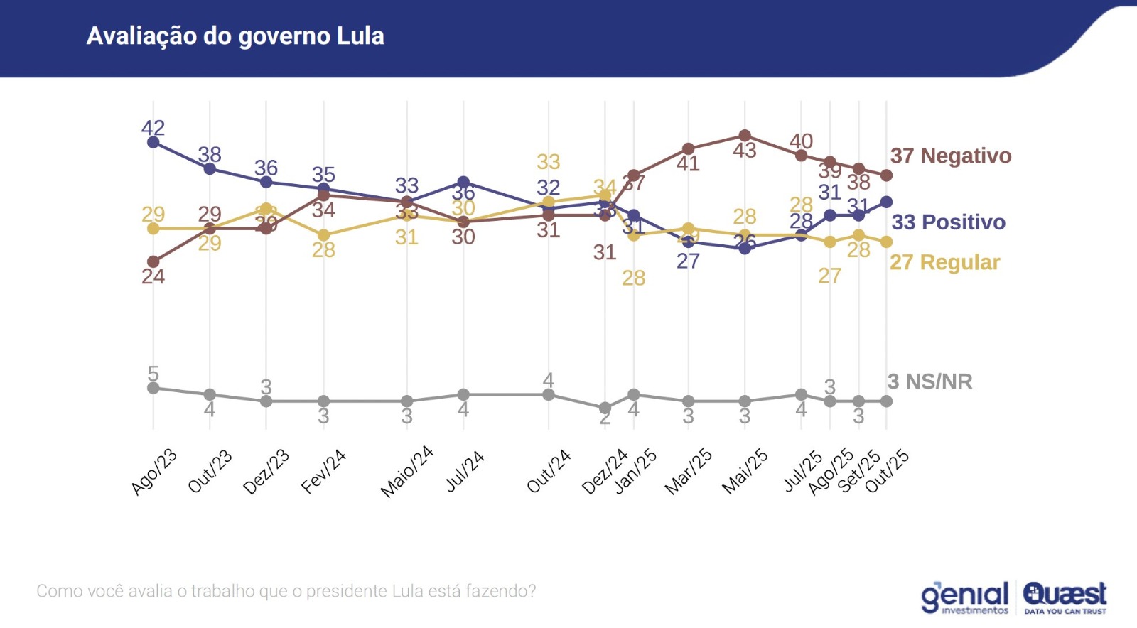 Na avaliação geral do governo, 33% classificam a gestão como positiva, 37% como negativa e 27% como regular. Esses números representam uma leve melhora em relação a setembro, quando 31% consideravam a administração positiva e 38% negativa.