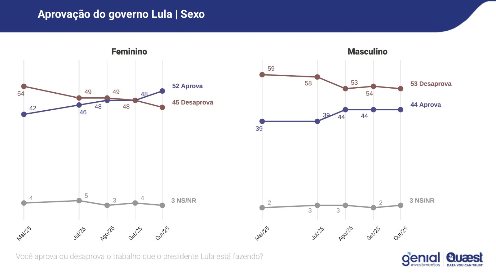 A pesquisa indica ainda que a faixa etária de 35 a 59 anos passou a aprovar mais o governo — 51% de aprovação e 46% de desaprovação — invertendo os percentuais de setembro. Entre os idosos, de 60 anos ou mais, os índices estão empatados em 50% e 46%, respectivamente.