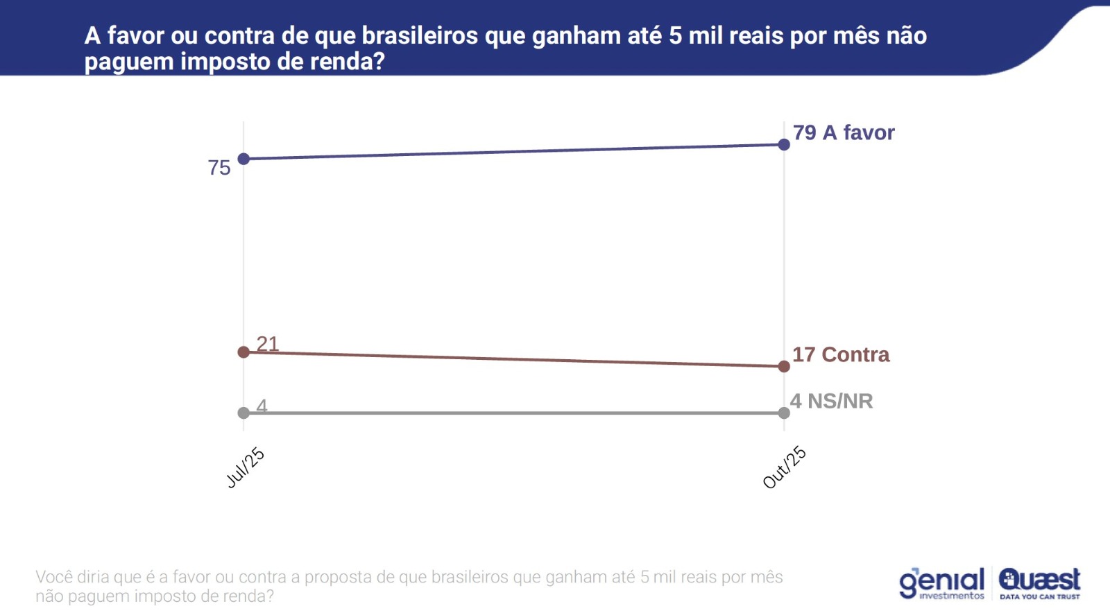 O levantamento também questionou os entrevistados sobre temas econômicos e diplomáticos. Para 49%, Lula saiu fortalecido do encontro com Donald Trump na ONU, enquanto 27% acham que o presidente brasileiro saiu mais fraco. Além disso, 79% apoiam a proposta de isentar o Imposto de Renda para quem ganha até R$ 5 mil.