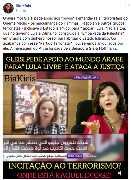 Num post criminoso, não apenas pelo massacre da língua portuguesa, escreve que Gleisi pede apoio do “Hammas, Hesbolah (sic) e outros grupos terroristas – inclusive o Estado Islâmico”.