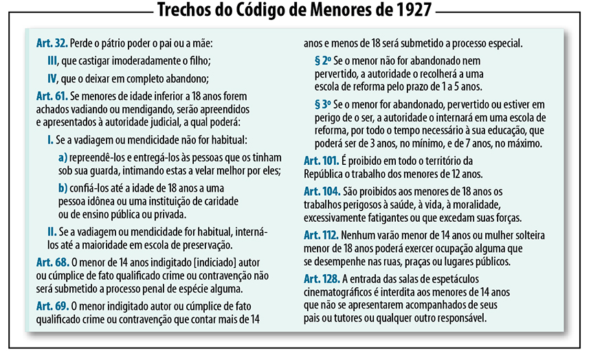 Em 1922, uma reforma do Código Penal elevou a maioridade de 9 para 14 anos. Com o Código de Menores de 1927, chegou-se aos 18 e a prisão de crianças e adolescentes ficou proibida. Em seu lugar, teriam de ser aplicadas medidas socioeducativas, como se chamam hoje.