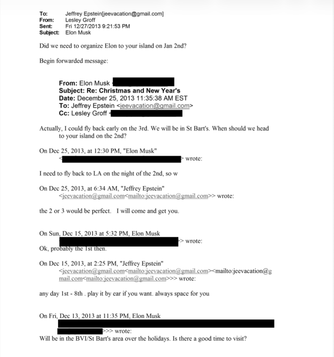 Em 13 de dezembro de 2013, Musk escreveu a Epstein dizendo que estaria na região das Ilhas Virgens Britânicas e de St. Barth durante o período de festas e perguntou se haveria um bom momento para visitá-lo.
