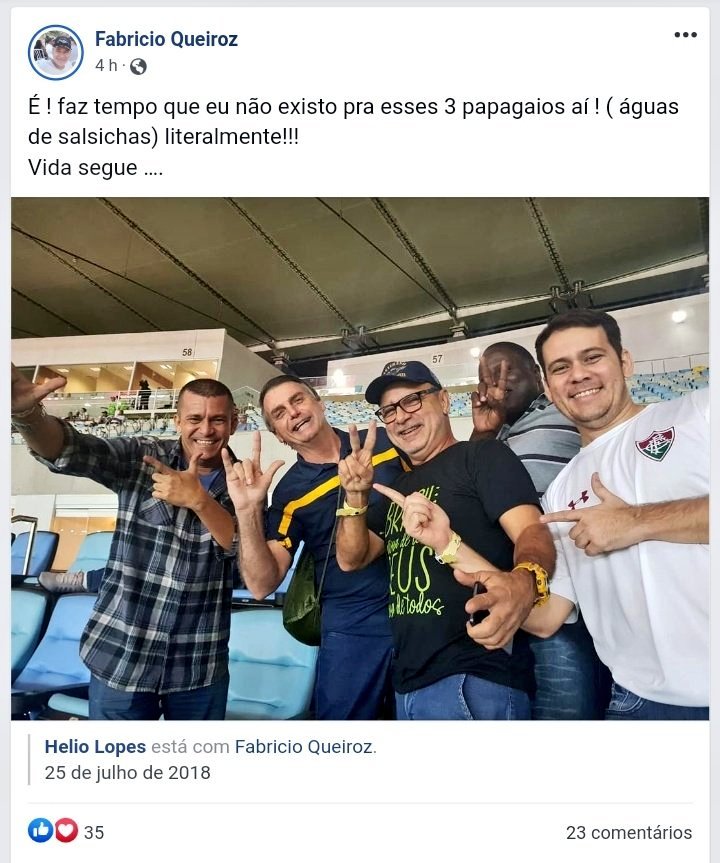 Em seu perfil no Facebook, Queiroz postou uma imagem em que aparece ao lado do presidente Jair Bolsonaro (sem partido), com Hélio Negão, o ex-assessor presidencial Max Guilherme Machado Moura e Fernando Nascimento Pessoa, assessor de Flávio, com uma legenda contundente.