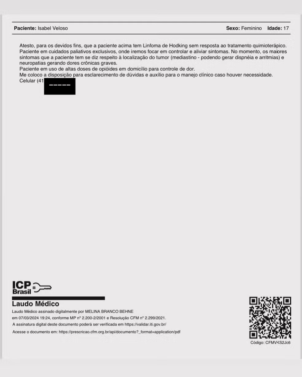 “Eu não iria postar isso, porque não devo satisfação a ninguém. Mas recebi muitos comentários que, pra ser paciente ‘terminal’ ou ‘paliativa’, tenho que ter aspecto de morte ou estar acamada sem poder me mexer. Então, pra quem tanto duvidou, e inclusive fizeram recortes de vídeos onde eu falava que estava bem, pra ganhar like e seguidor em cima. O laudo que tanto pediram está aqui”, disse.