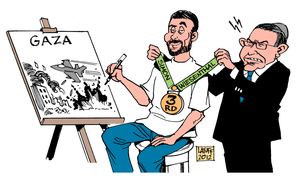O cartunista carioca Carlos Latuff entrou na lista anual do Centro Simon Wiesenthal dos 10 piores atos de antissemitismo do mundo. Latuff desenhou o premiê israelense Benjamin Netanyahu torcendo um bebê palestino sobre uma urna, durante a guerra na Faixa de Gaza, ilustrando sua opinião de que a grande motivação de Netanyahu era ganhar votos nas eleições de janeiro. “Durante o conflito recente instigado pelo Hamas contra o estado judeu, o cartunista brasileiro fustigou Israel e o primeiro ministro por fazer o que qualquer líder mundial faria contra os ataques de foguetes cujo alvo eram civis inocentes”, diz o relatório que condenava o desenhista.