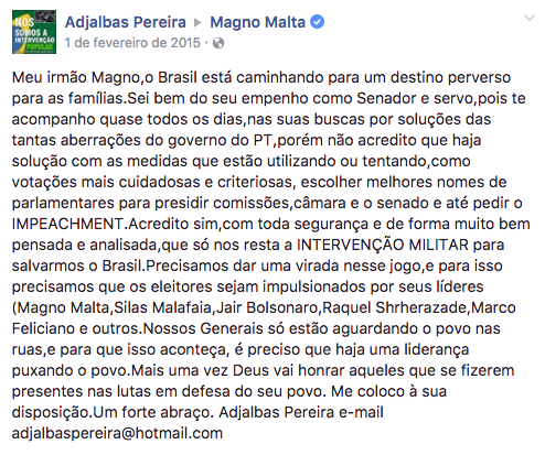 “Acredito sim, com toda segurança e de forma muito bem pensada e analisada, que só nos resta a INTERVENÇÃO MILITAR para salvarmos o Brasil. Precisamos dar uma virada nesse jogo, e para isso precisamos que os eleitores sejam impulsionados por seus líderes (Magno Malta, Silas Malafaia, Jair Bolsonaro, Raquel Shrherazade, Marco Feliciano e outros).”