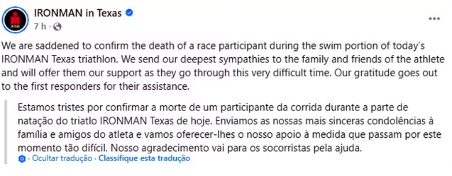 A organização do evento confirmou a morte em nota oficial e prestou condolências. “Estamos tristes por confirmar a morte de uma participante da corrida durante a parte de natação do triatlo IRONMAN Texas de hoje. Enviamos as nossas mais sinceras condolências à família e amigos do atleta e vamos oferecer-lhes o nosso apoio à medida que passam por este momento tão difícil. Nosso agradecimento vai para os socorristas pela ajuda”, informou.