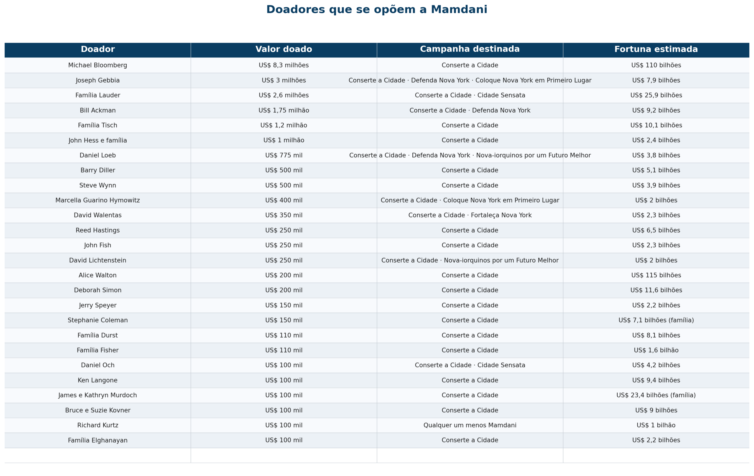 No total, as doações superaram US$ 22 milhões. Entre os nomes mais influentes estão o ex-prefeito de Nova York Michael Bloomberg e o investidor Bill Ackman, ambos críticos das propostas de aumento de impostos para grandes fortunas.