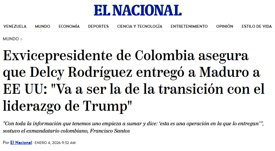 “Ex-vice-presidente da Colômbia afirma que Delcy Rodríguez entregou Maduro aos EUA: Ela supervisionará a transição sob a liderança de Trump”.
