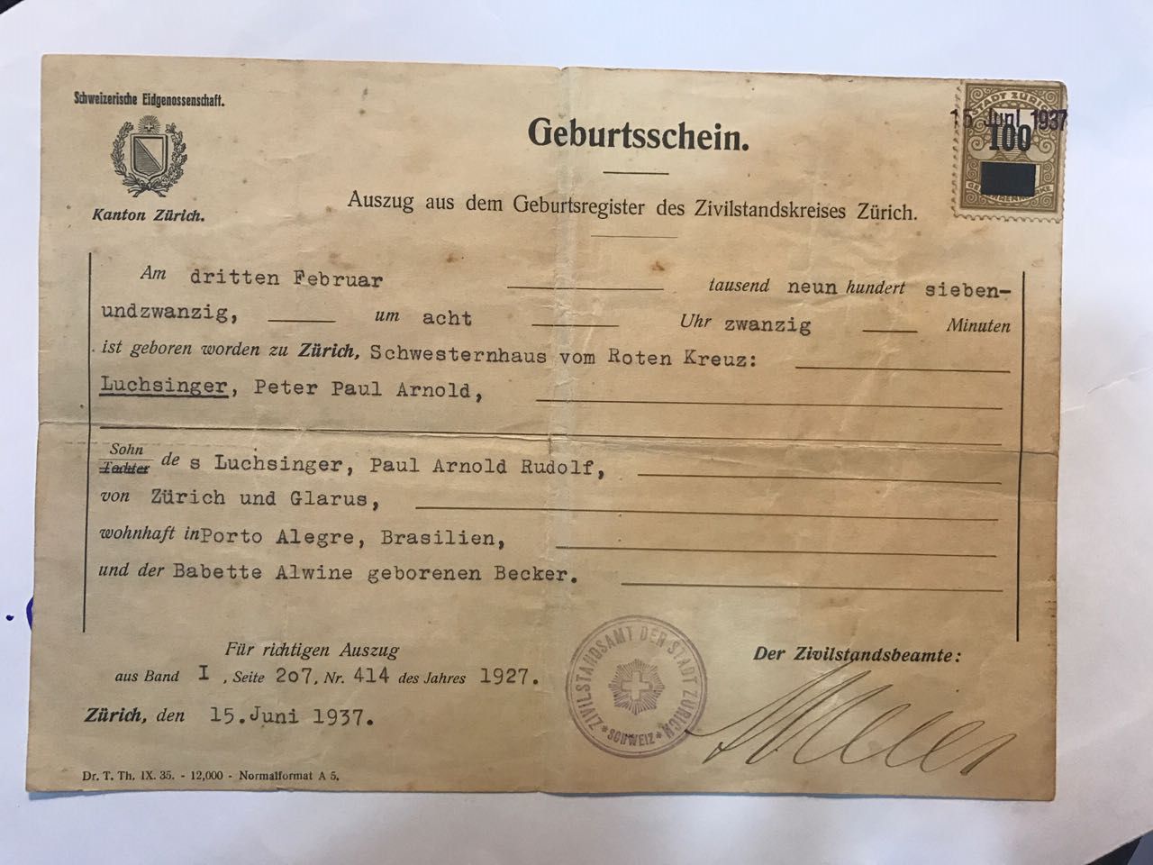 RL: Tenho e estou te enviando a certidão de nascimento dele por email (veja abaixo). Meu avô é suíço e o Nassif poderia ter se aprofundado melhor na história dele. Inclusive na família e sua origem.