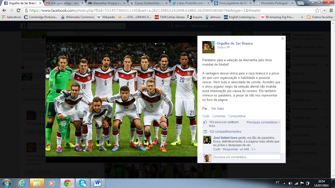 O título alemão na Copa do Mundo foi comemorado por simpatizantes do nazismo que se disfarçam sob o “orgulho de ser branco”. Em uma postagem no Facebook, ignorantes chamaram a conquista da seleção de Müller, Schweinsteiger e companhia de “vitória para a raça branca”. O preconceito e a estupidez os impedem de ver que o gol marcado por Mario Götze foi mais um golpe nas teorias fajutas da superioridade ariana.