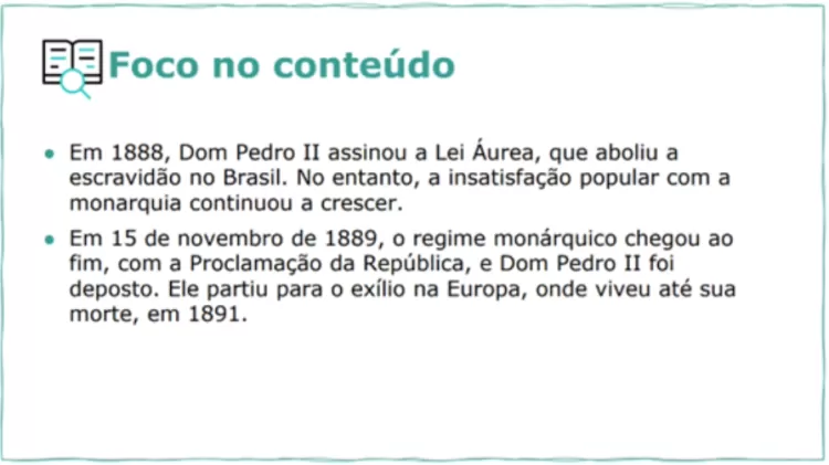 Em um dos slides, o conteúdo proveniente da Secretaria de Estado de Educação, comandada por Renato Feder, afirmou que foi Dom Pedro 2º, e não sua filha, a Princesa Isabel, que assinou a Lei Áurea em 1888. A informação equivocada está presente nos materiais de história produzidos para o 8º ano do Ensino Fundamental.