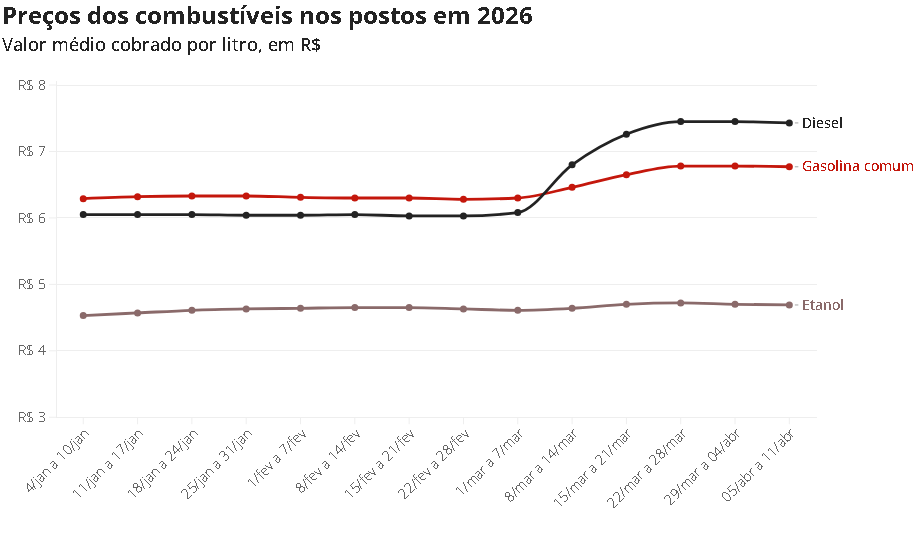 As oscilações nos preços do petróleo internacional são um reflexo das incertezas quanto à duração e intensidade do conflito no Oriente Médio. Com a desaceleração nos preços do petróleo, os combustíveis começaram a apresentar uma pequena retração nas semanas seguintes à forte alta registrada logo após o início dos ataques. No entanto, o impacto nas bombas foi mais demorado, com o preço do diesel chegando a R$ 6,80 na segunda semana de março.