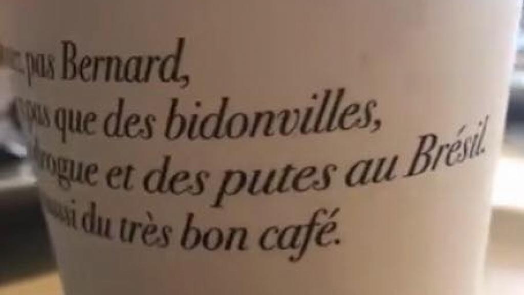 A mineira Sinara Beguin, de 37 anos, comprou um café para viagem, em Lille, no norte da França. Quando chegou em casa, reunida com a família à mesa, leu, estupefata, a seguinte frase, impressa no copo descartável: “Não dê ouvidos ao Bernard, não há apenas favelas, drogas e prostitutas no Brasil, há também um café muito bom”.