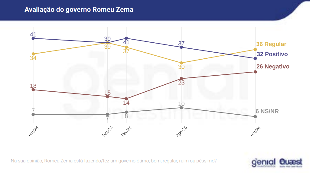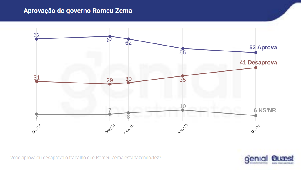 A pesquisa foi encomendada pela Genial Investimentos e ouviu 1.482 eleitores entre os dias 22 e 26 de abril. A margem de erro é de 3 pontos percentuais, com nível de confiança de 95%. O levantamento foi registrado no Tribunal Superior Eleitoral (TSE) sob o número MG-08646/2026.
