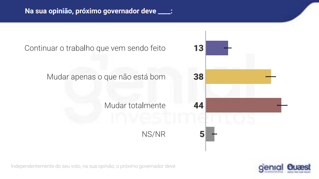 Outro dado que chama atenção é o desejo de mudança entre os eleitores mineiros. Apenas 13% defendem a continuidade da atual gestão, enquanto 44% querem mudança total e 38% preferem mudanças parciais. Outros 5% não souberam responder.
