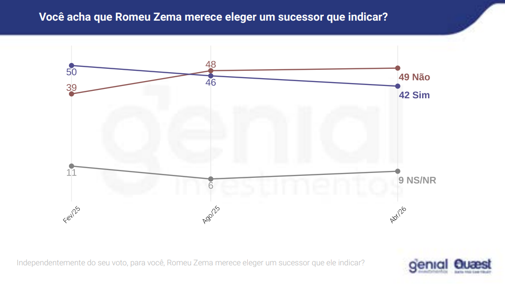 A resistência também aparece quando o tema é sucessão política: 49% dizem que Zema não merece eleger um sucessor, contra 42% que consideram que sim. Outros 9% não souberam ou não responderam.