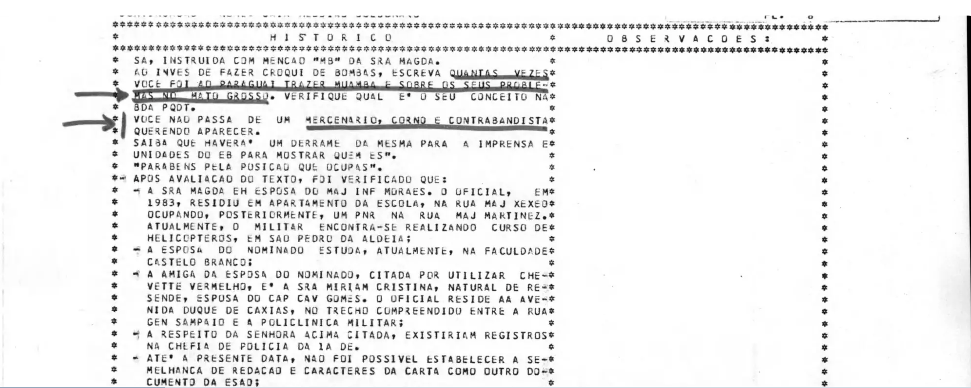 Em relatórios, era chamado de “mercenário, corno e contrabandista”. “Ao invés de fazer croqui de bombas, escreva quantas vezes você foi ao Paraguai trazer muamba”, diz um trecho.