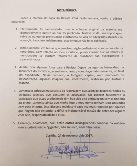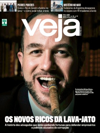 A capa da última edição da revista Veja estampa um retrato do criminalista Adriano Bretas com um charuto e um sorriso. A chamada fala nos “novos ricos” da “lava jato”. Seriam os advogados que enriqueceram trabalhando na defesa de clientes envolvidos na operação. Porém, logo que a publicação saiu, alguns advogados passaram a contestar o conteúdo. Agora, Bretas se junta ao time dos críticos.