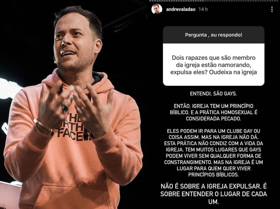 “A igreja tem um princípio bíblico. E a prática homossexual é considerada pecado. Eles podem ir para um clube gay. Mas, na igreja, não dá. A igreja é lugar de quem quer viver princípios bíblicos. Não é sobre expulsar. É sobre entender o lugar de cada um”.