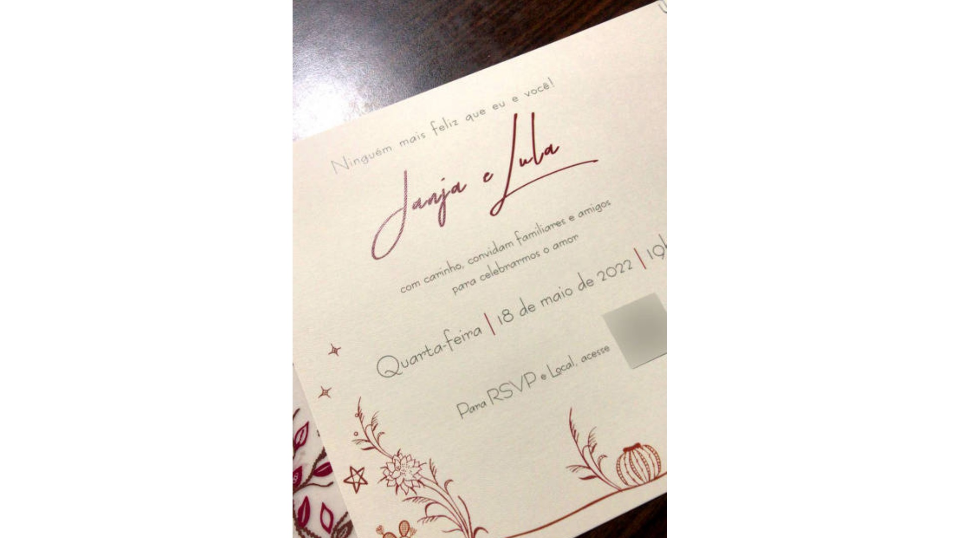 Os convites, já entregues, não dizem onde irá acontecer a cerimônia e pedem ainda que os convidados não levem celulares. “Nosso momento será único, por isso recomendamos estar presente nele e longe dos celulares”, diz o comunicado.