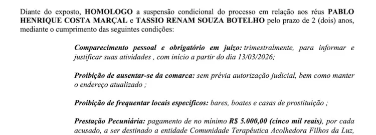 A juíza advertiu que o descumprimento de qualquer uma das condições ou a instauração de novo processo por outro crime ou contravenção poderá resultar na revogação do benefício. Com isso, a ação penal volta a correr, sob o risco de condenação.