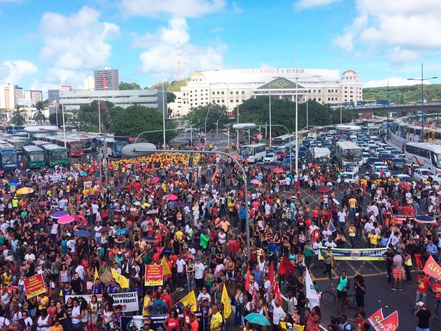 Falou-se em 100 mil pessoas na manifestação contra a reforma da Previdência hoje, no Campo Grande, em Salvador. Nada surpreendente, acaso não tivesse havido outro protesto pela manhã, na Avenida Paralela, com o mesmo número aproximado de manifestantes.