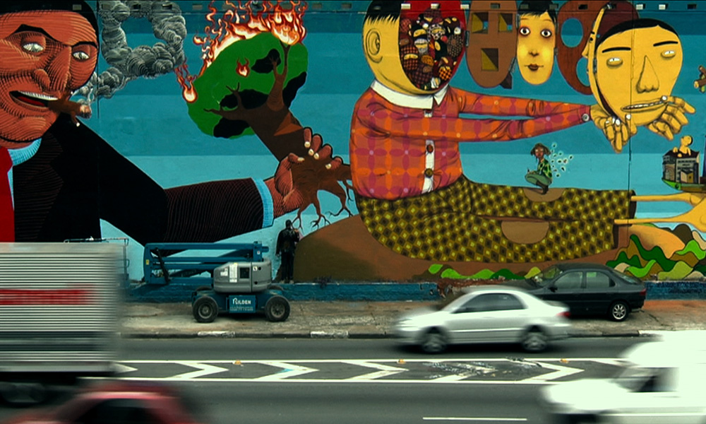 O cinza não é metafórico da selva de pedra. É a cor imposta por um serviço terceirizado pela prefeitura de São Paulo que despeja com jatos de tinta cinza todas as pichações e grafites que não agradem aos “críticos de arte” da empresa terceirizada. Sim, o critério é subjetivo e as justificativas do porque manter-se um e deletar o outro traço são os momentos mais hilariantes do filme. Se não fossem uma agressão, claro.