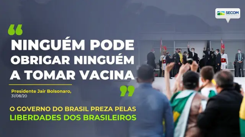 Agora, porém, enquanto estamos na esperança de alcançarmos uma vacina que nos livre do novo coronavírus, o senhor Jair Bolsonaro, do alto da presidência da República que ocupa, que não haverá, se o imunizante for obtido, vacinação obrigatória porque, segundo a mensagem da Secretaria de Comunicação da Presidência, “o governo do Brasil preza pela liberdade dos brasileiros”.