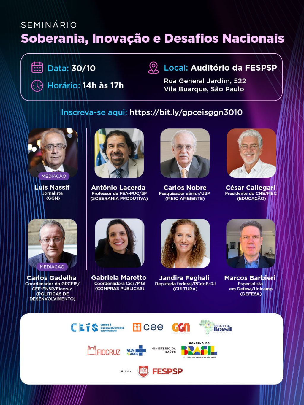 As inscrições estão abertas para o seminário “Soberania, Inovação e Desafios Nacionais”, que acontece no dia 30 de outubro, das 14h às 17h, no auditório da FESPSP (Fundação Escola de Sociologia e Política de São Paulo). O evento é gratuito e presencial, mas com vagas limitadas.