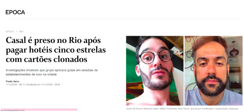 A Polícia Civil do Rio investiga um grupo de criminosos que, usando cartões clonados, desfrutam da estadia de hotéis cinco estrelas na cidade. Um casal gay foi preso acusado de aplicar o golpe em pelo menos dois estabelecimentos de alto luxo em Copacabana, na Zona Sul, e em Santa Teresa, na Região Central.