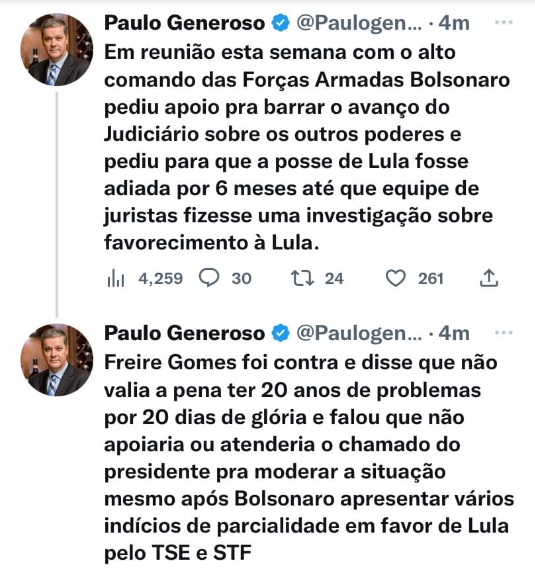 Em 30 de dezembro do ano passado, Generoso escreveu em sua conta no Twitter: “Em reunião com o alto comando das Forças Armadas, Bolsonaro pediu apoio para barrar o avanço do Judiciário sobre os outros poderes e pediu para que a posse de Lula fosse adiada por 6 meses até que a equipe de juristas fizesse uma investigação sobre favorecimento a Lula”.