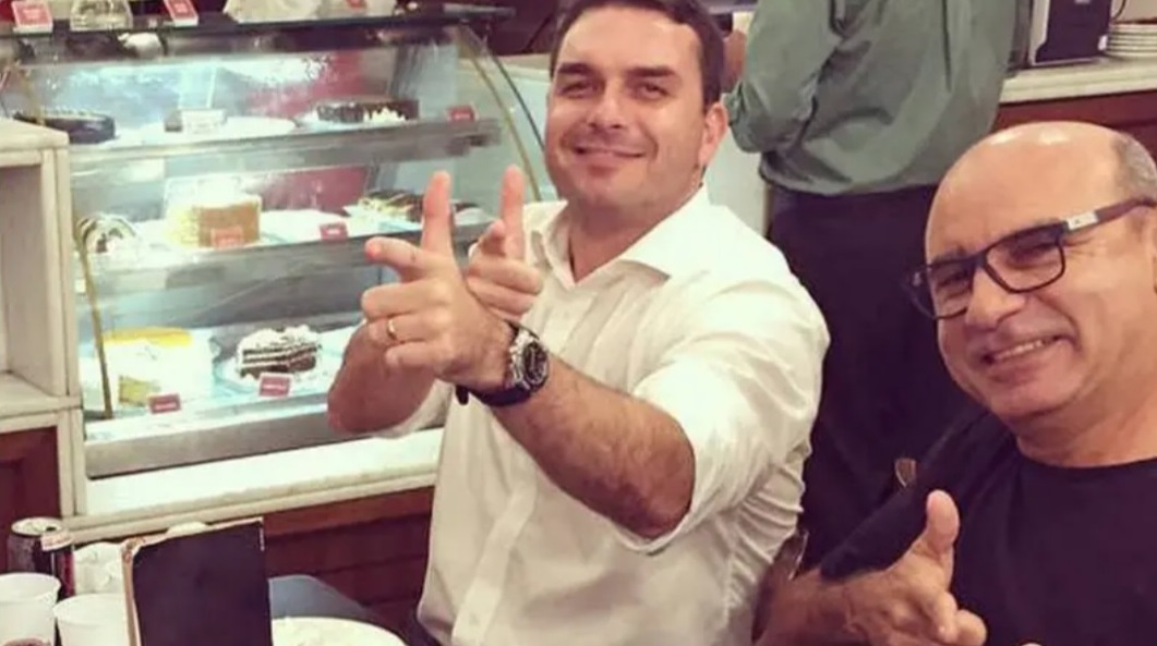Flávio Bolsonaro fazendo arminha com as mãos ao lado de Fabrício Queiroz. Reprodução