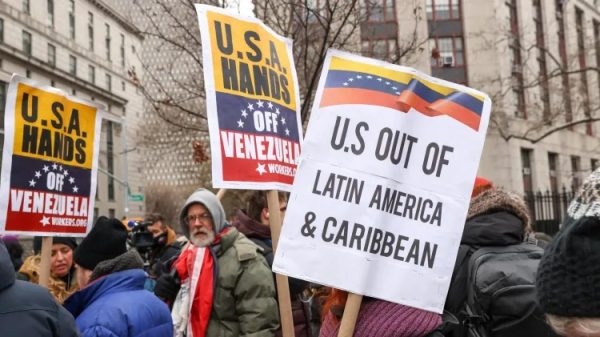 Em frente ao tribunal, manifestantes se reuniram em protesto contra as ações dos Estados Unidos, com cartazes que diziam “Estados Unidos fora da América Latina e do Caribe” e “tire suas mãos da Venezuela”. A presença dos manifestantes reflete a divisão política sobre a operação que resultou na prisão de Maduro e sua esposa, e a tensão sobre a intervenção dos EUA na Venezuela.