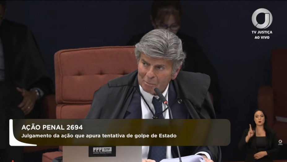 O ministro Luiz Fux durante o julgamento do núcleo 4 da trama golpista, nesta terça (21). Foto: Reprodução