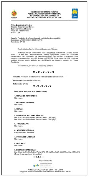 A PM-DF acompanha o dia a dia da casa (acima dia 28/03) e faz relatos periódicos ao ministro Moraes.
