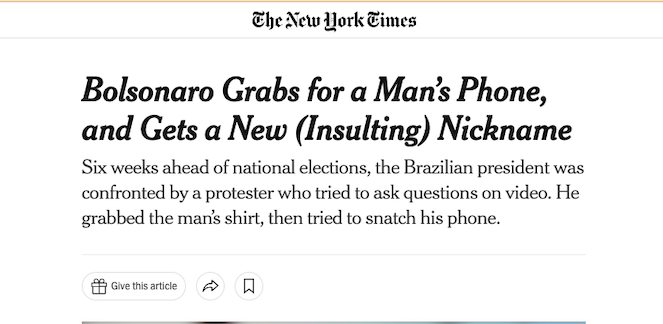 “Foi uma cena surpreendente, mesmo para os padrões de um presidente que reescreveu os padrões do Brasil de como o líder da maior nação da América Latina deve agir. (Pense em ataques vulgares a seus rivais, um fluxo de declarações falsas e uma recusa em admitir se foi vacinado.) O vídeo do incidente viralizou na internet brasileira – um presidente brigando com um eleitor apenas seis semanas antes das eleições nacionais”, diz o texto.