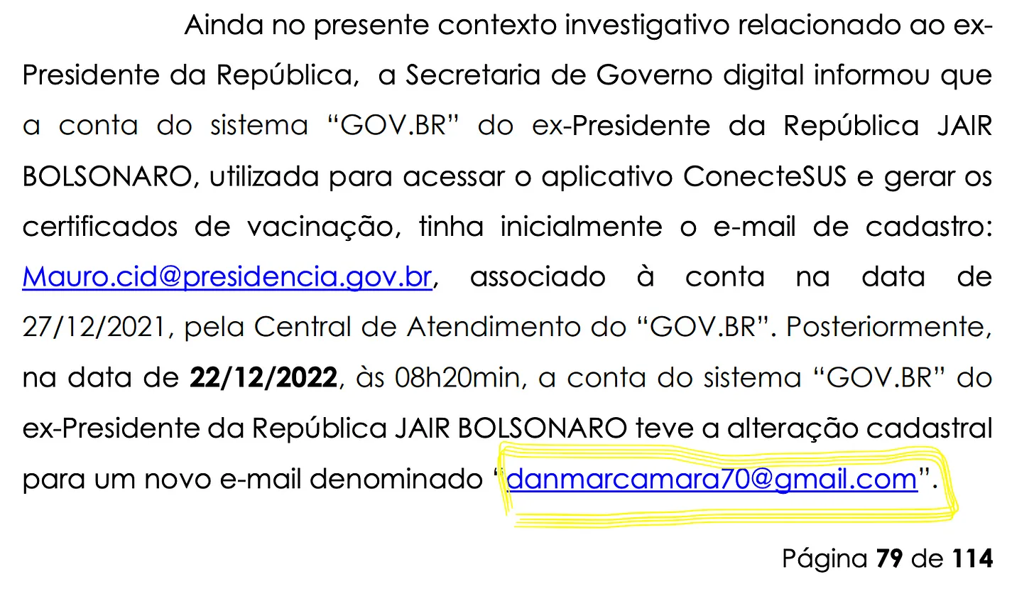 O endereço de e-mail usado para acessar o sistema de Bolsonaro no ConecteSus e gerar certificados de vacinação fantasma era: danmarcacamara70@gmail.com. Segundo a PF, o e-mail pertencia a Marcelo Costa Camara, então assessor especial do Presidente da República.