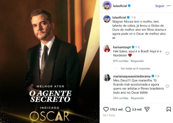 Em publicação no Instagram, Lula afirmou: “Wagner Moura tem o molho, tem talento de sobra, já levou o Globo de Ouro de melhor ator em filme drama e agora pode vir o Oscar de melhor ator”, ao comentar a indicação do artista.