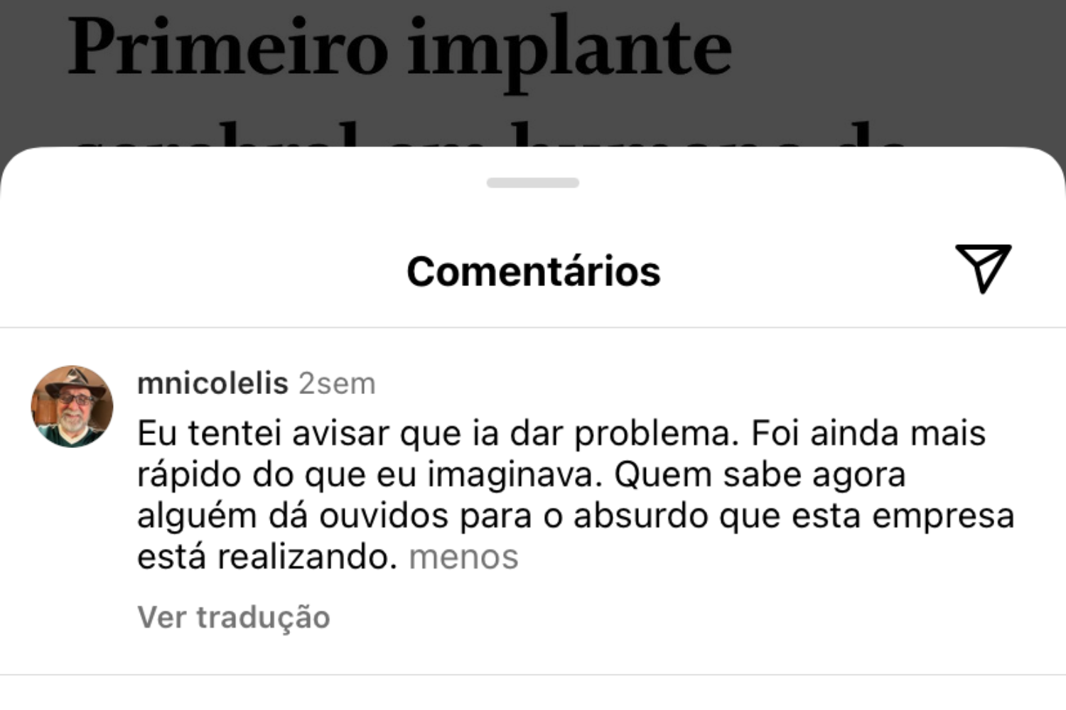 “Infelizmente, tudo que foi previsto se confirmou. Uma lástima pra este paciente. E agora, vão fazer o quê? Remover o implante e trazer junto tecido cerebral sadio? Nenhum neurocirurgião vai querer fazer isso”, disse Nicolelis em outra postagem.