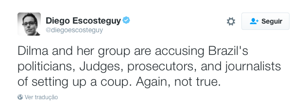Ela comentava sobre Diego Escosteguy, que tenta vender seu peixe em inglês desde março deste ano. “Dilma e seu grupo estão acusando políticos brasileiros, juízes, promotores e jornalistas estarem armando um golpe. Isso é mentira”, escreveu.