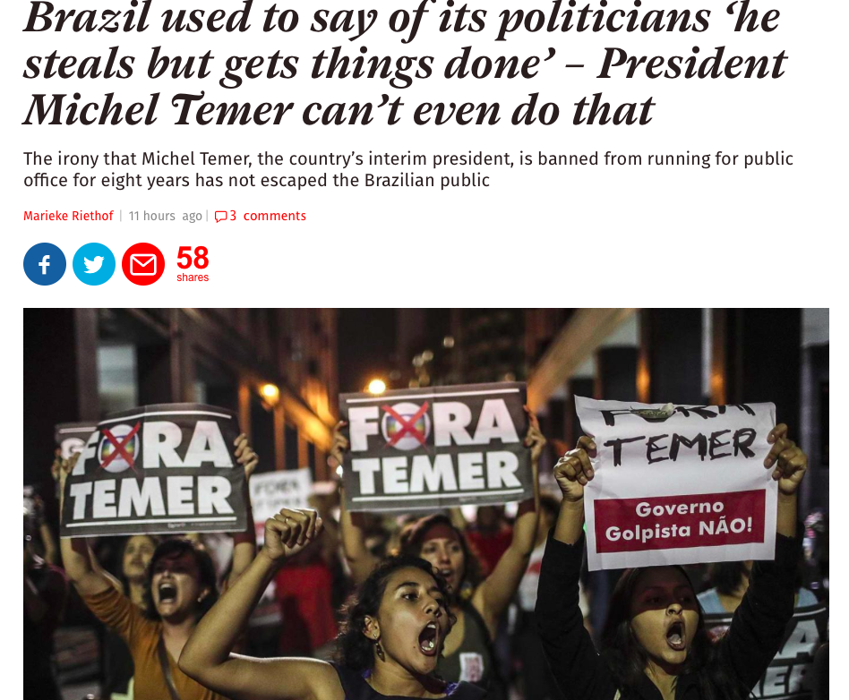 Uma frase brasileira comum referindo-se à prevalência da corrupção entre os políticos do país é “rouba mas faz”, que no caso de Temer reflete a esperança de que, se o seu governo oferece um caminho para sair da crise económica, isso pode superar os escândalos de corrupção. Depois de cinco meses no poder, no entanto, Temer enfrenta uma recessão econômica profunda, que segundo as previsões do Banco Mundial deve durar os próximos dois anos.