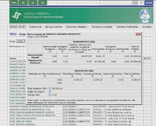 No Paraná, o juiz federal Marcelo Adriano Micheloti recebeu em julho R$ 92.510,19. Como em grande parte dos casos dos juízes daquele estado, a remuneração mensal gira em torno de R$ 34 mil, sem os descontos. Mas nesse mês o magistrado levou um acréscimo, chamado de “indenização”, de R$ 67.544,28.