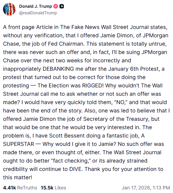 A tensão entre Trump e o banco se intensificou nos últimos dias após reportagem do Wall Street Journal. O jornal informou que o presidente teria cogitado indicar o CEO do JPMorgan, Jamie Dimon, para a presidência do Federal Reserve.