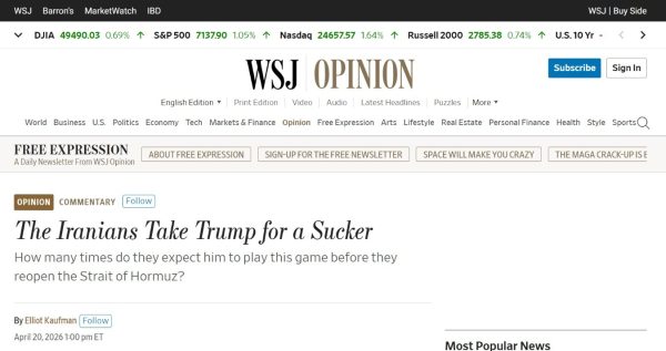 “Um idiota do Conselho Editorial do The Wall Street Journal, chamado Elliot Kaufman, acabou de escrever um artigo de opinião intitulado ‘Os iranianos acham que Trump é um otário'”, escreveu Trump na plataforma.