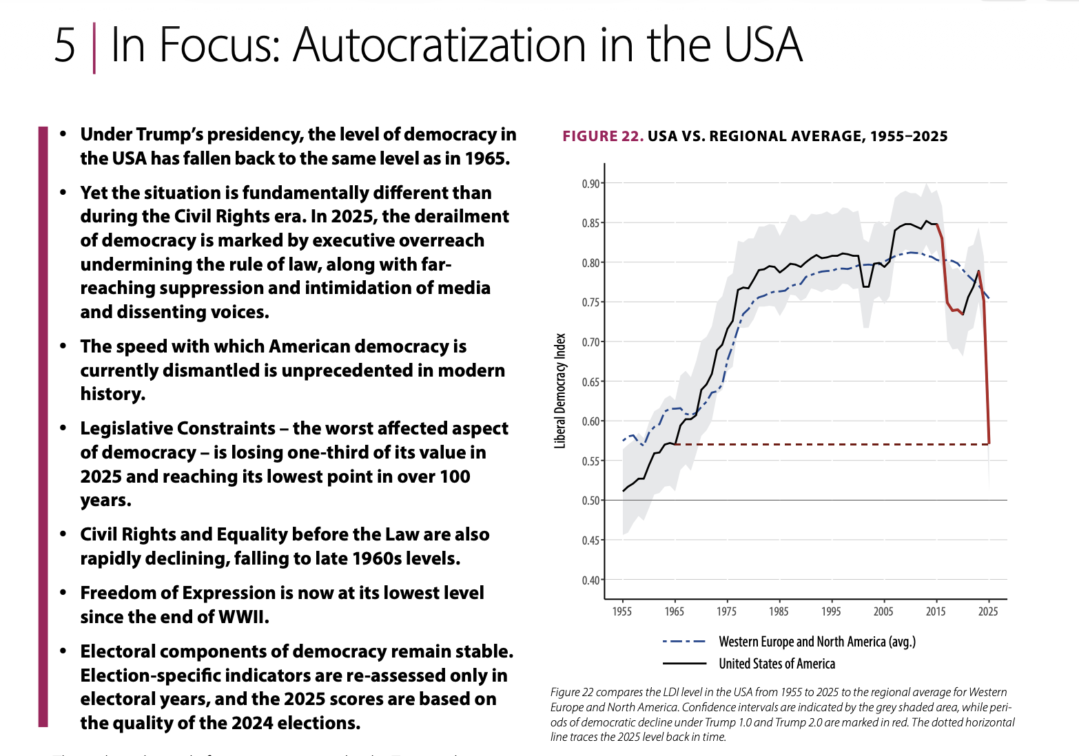 O impacto desse retrocesso democrático dos Estados Unidos vai além das fronteiras nacionais, com repercussões no cenário global. Em 2025, a queda no Índice de Democracia Liberal (LDI) foi mais acentuada na América do Norte e Europa Ocidental, com países como os EUA, Reino Unido e Itália vivenciando uma erosão das liberdades políticas e das instituições democráticas.