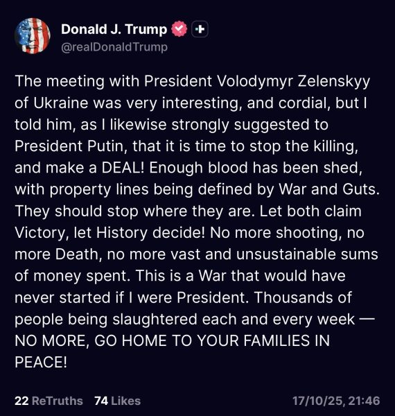 “A reunião com o presidente ucraniano Volodymyr Zelensky foi muito interessante e cordial, mas eu disse a ele, como também sugeri enfaticamente ao presidente Putin, que era hora de parar com a matança e chegar a um ACORDO”, escreveu Trump em sua rede Truth Social.