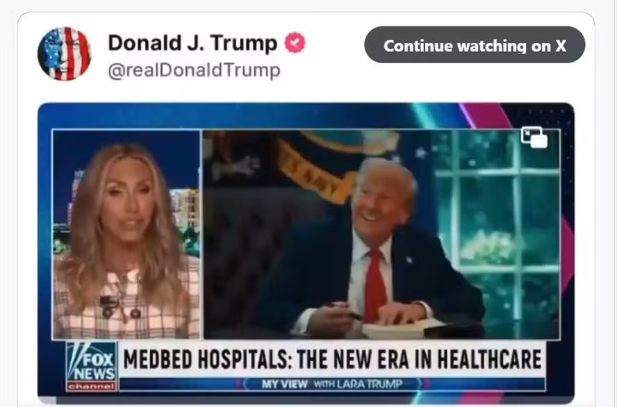 O clipe simulava um programa da Fox News e mostrava Lara Trump, nora do republicano, anunciando um fictício “lançamento histórico” de um sistema de saúde a partir da Casa Branca.
